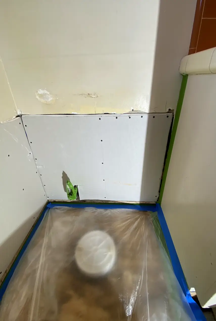 A stable, perfectly sized backing patch is secured beneath the hole to support the repair. Skipping this can cause the patch to shift or sag, making seams noticeable under normal light angles and shadows.