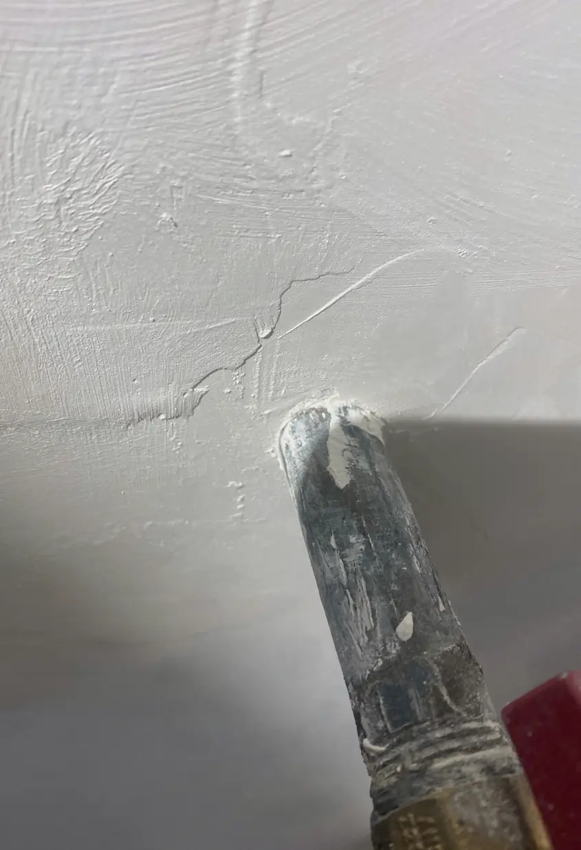 Settling foundations and temperature shifts strain drywall panels, causing thin cracks along corners or joints with chipped texture. These develop slowly but deepen, making patches stand out visibly.
