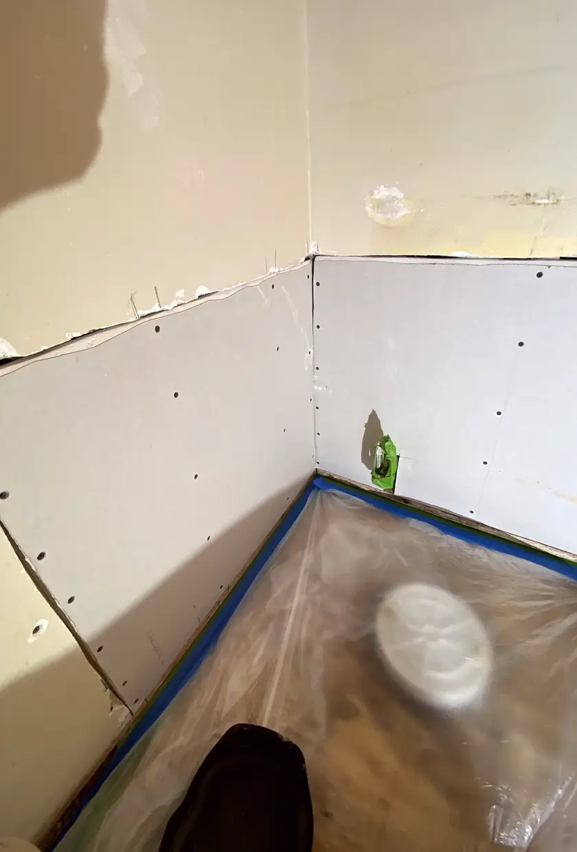 The wall had soft spots and dents from water damage. The initial band-aid patch sank after a week. This time they removed bad drywall, installed fresh drywall installation layers, and blended the texture carefully.