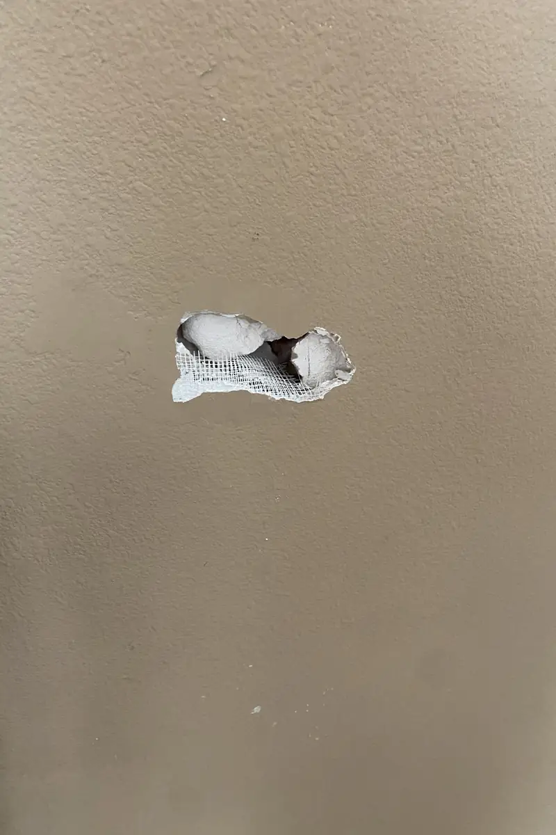 There was a big hole from the door slam; tried taping it myself but the edges cracked. The handyman fixed the sheetrock repair fully, no patch lines showing.