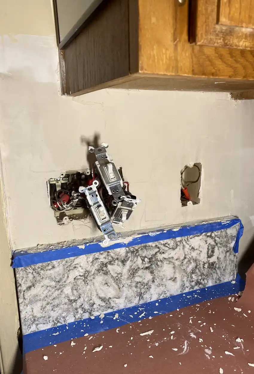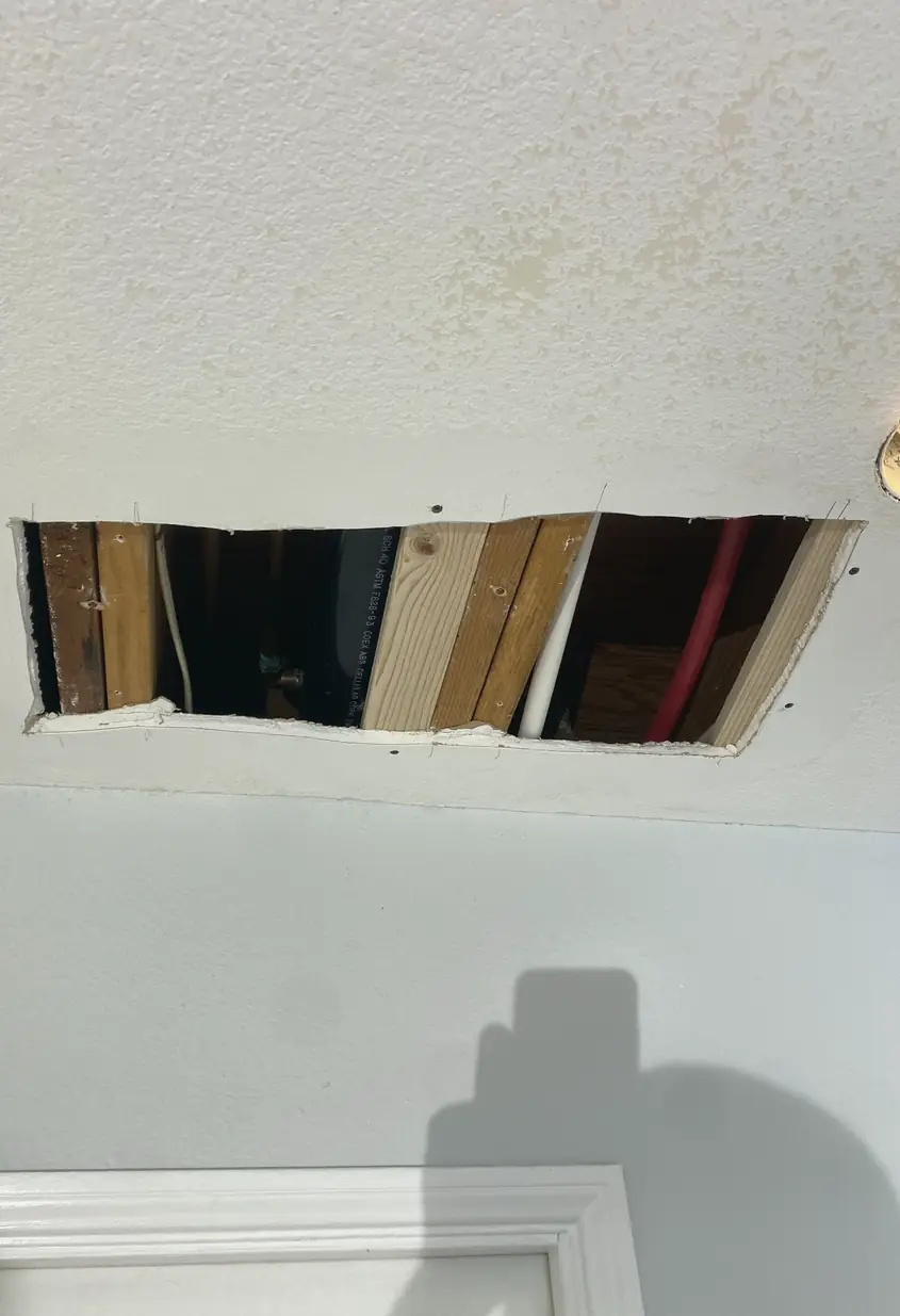 Cutouts made for plumbing or electrical repairs leave jagged openings. The edges often crumble or crack, revealing rough patches that don't blend cleanly with the surrounding wall texture, disrupting the drywall’s smooth finish.