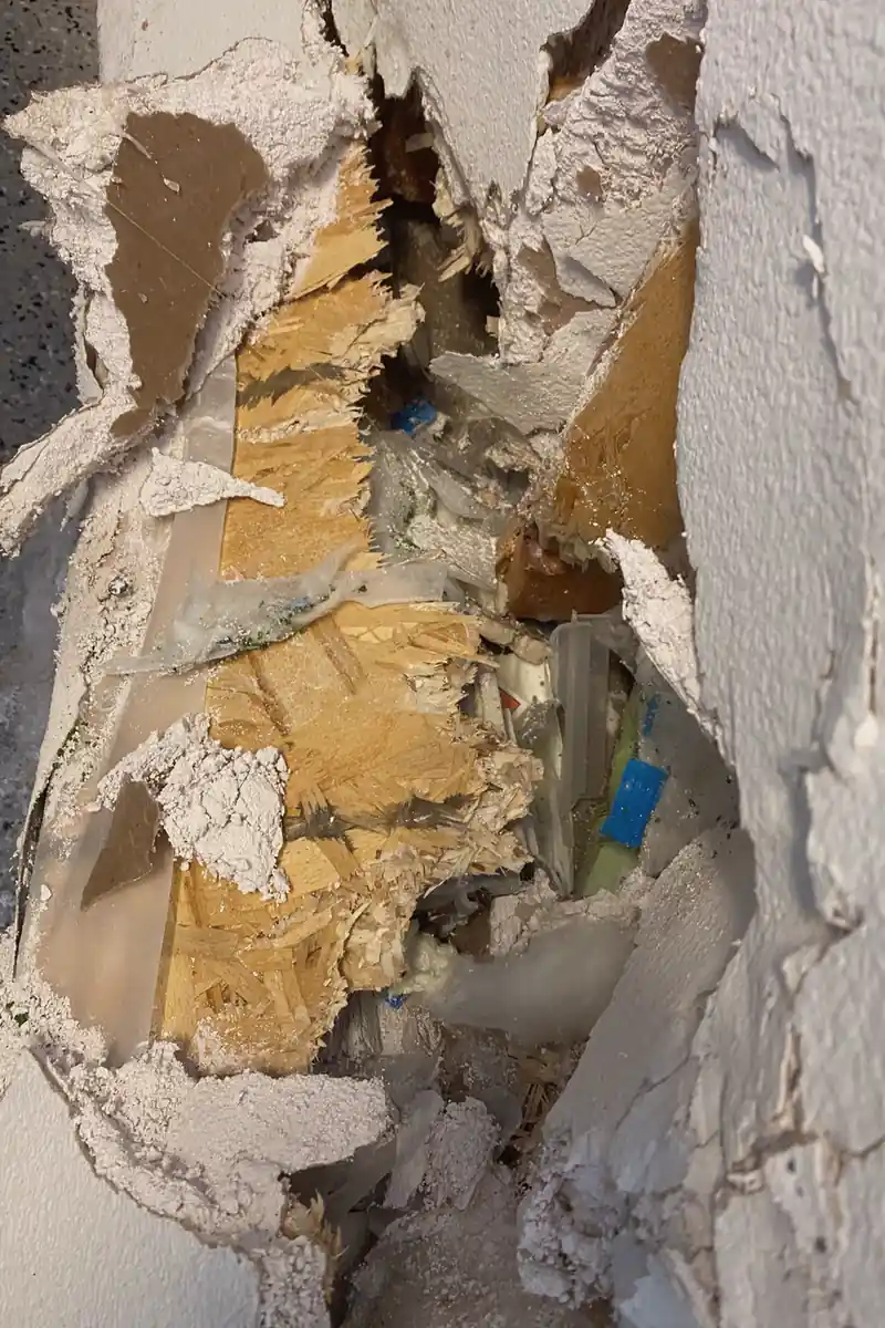 A heavy chair slipped from the sofa and crashed into the drywall, leaving a jagged hole with cracked edges right at eye level. The damage wasn’t just a dent—it tore away the drywall paper and crumbled some of the corner beads, making the wall surface uneven and exposing the wooden stud frame inside. Every time the sun hit that spot, the rough edges cast shadows that made the flaw impossible to ignore.