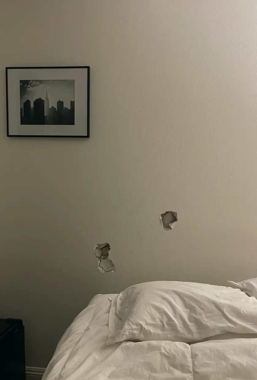 When a heavy chair slid across the wall, it tore a jagged hole just above the baseboard, breaking the drywall edge and leaving a rough patch where paint chipped away. The damage immediately caught the light, making the dent impossible to ignore and leaving the room feeling unfinished. I looked at that cracked surface every day, knowing it would only get worse as shadows deepened along the rough edges.