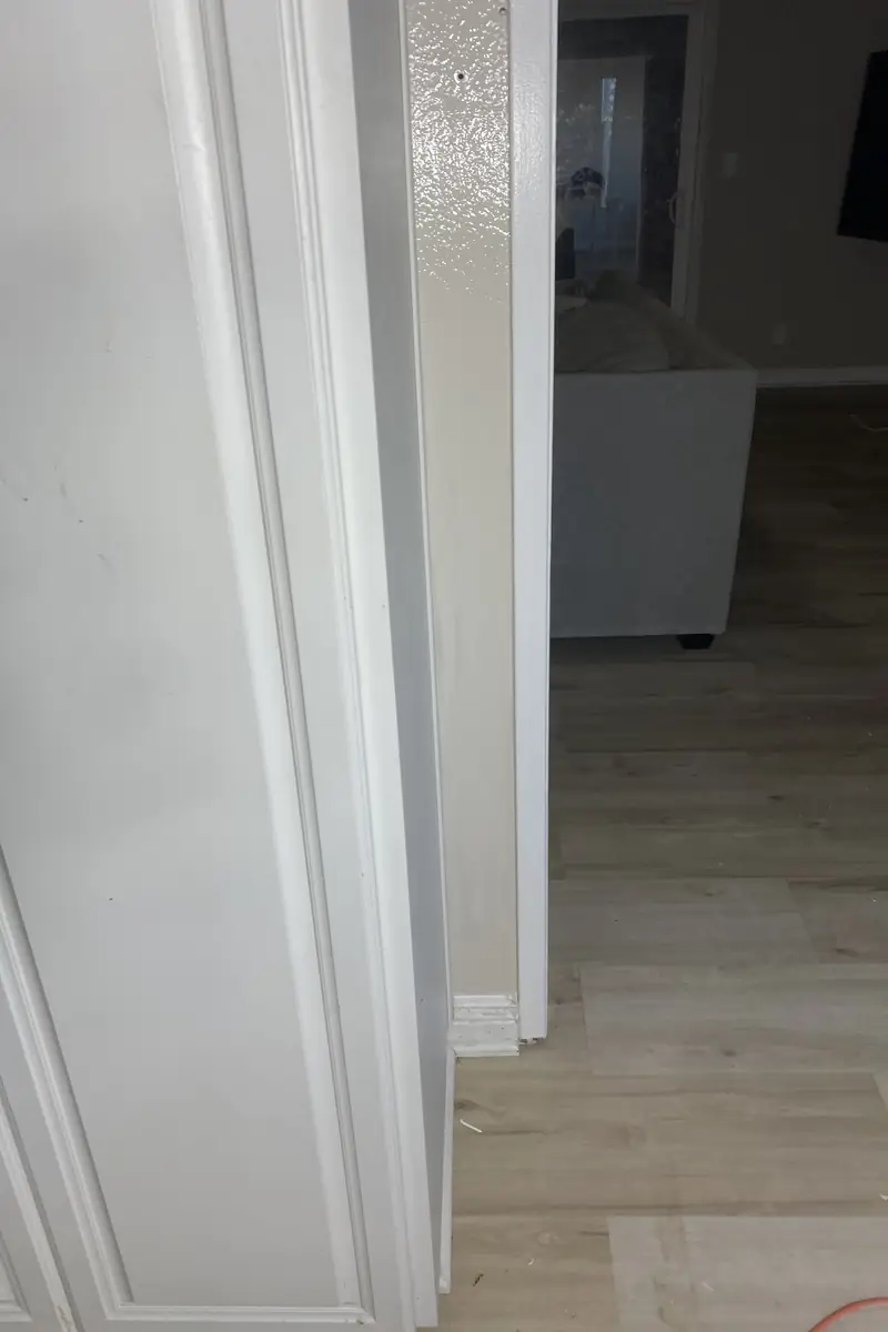 A big hole by the door frame kept catching my eye. Tried patching myself but the edges cracked next day. They came back for a second pass, sanding and blending the drywall and paint so it doesn’t draw attention anymore.