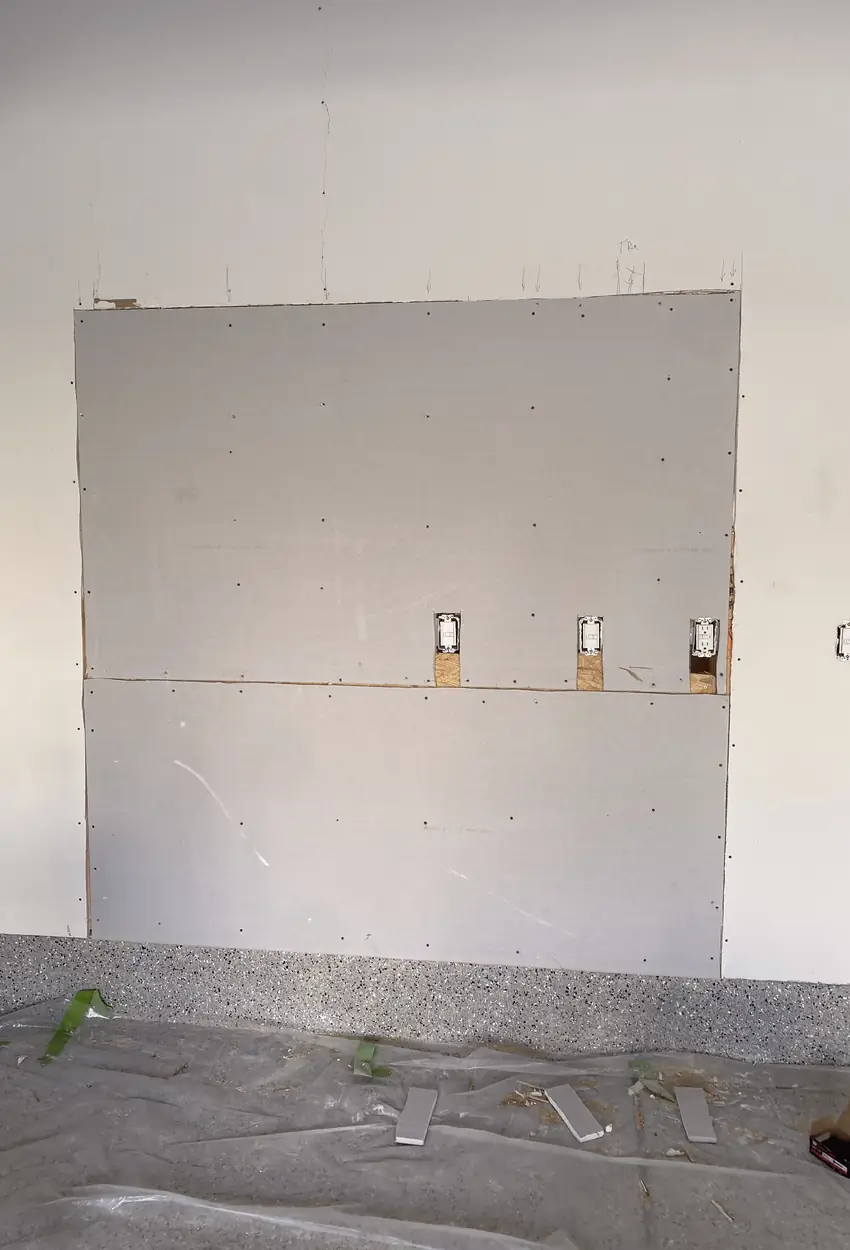 Extensive prep addresses large damaged areas with mismatched drywall textures. Several dryings and careful blending across the surface are needed to make the repair invisible and durable.