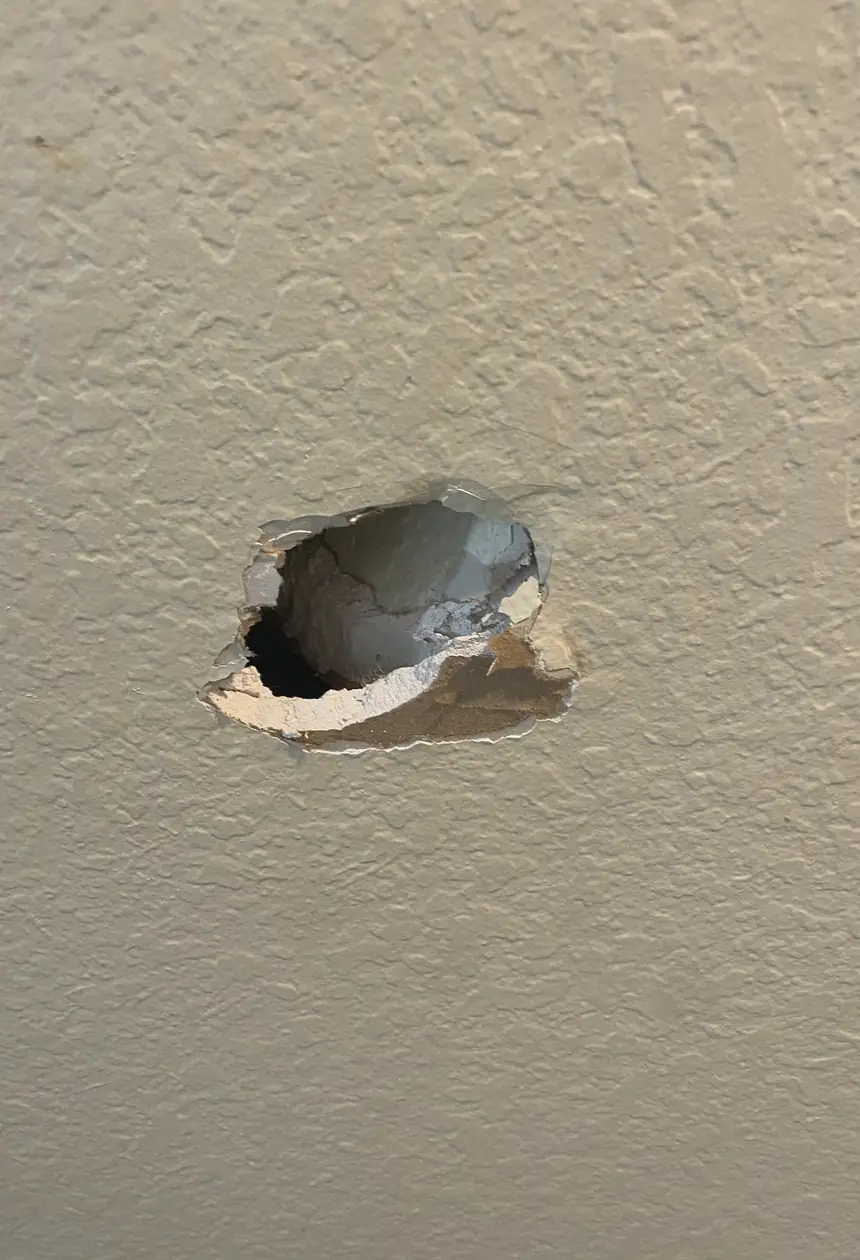 The moment I slammed the door, a sharp crack echoed through the hallway. Peeling back the torn drywall, I saw the jagged hole with a broken edge stretching unevenly across the corner—ugly and immediately distracting every time I passed by. The exposed gypsum and rough texture caught the light harshly, drawing the eye to what should have been an invisible wall.