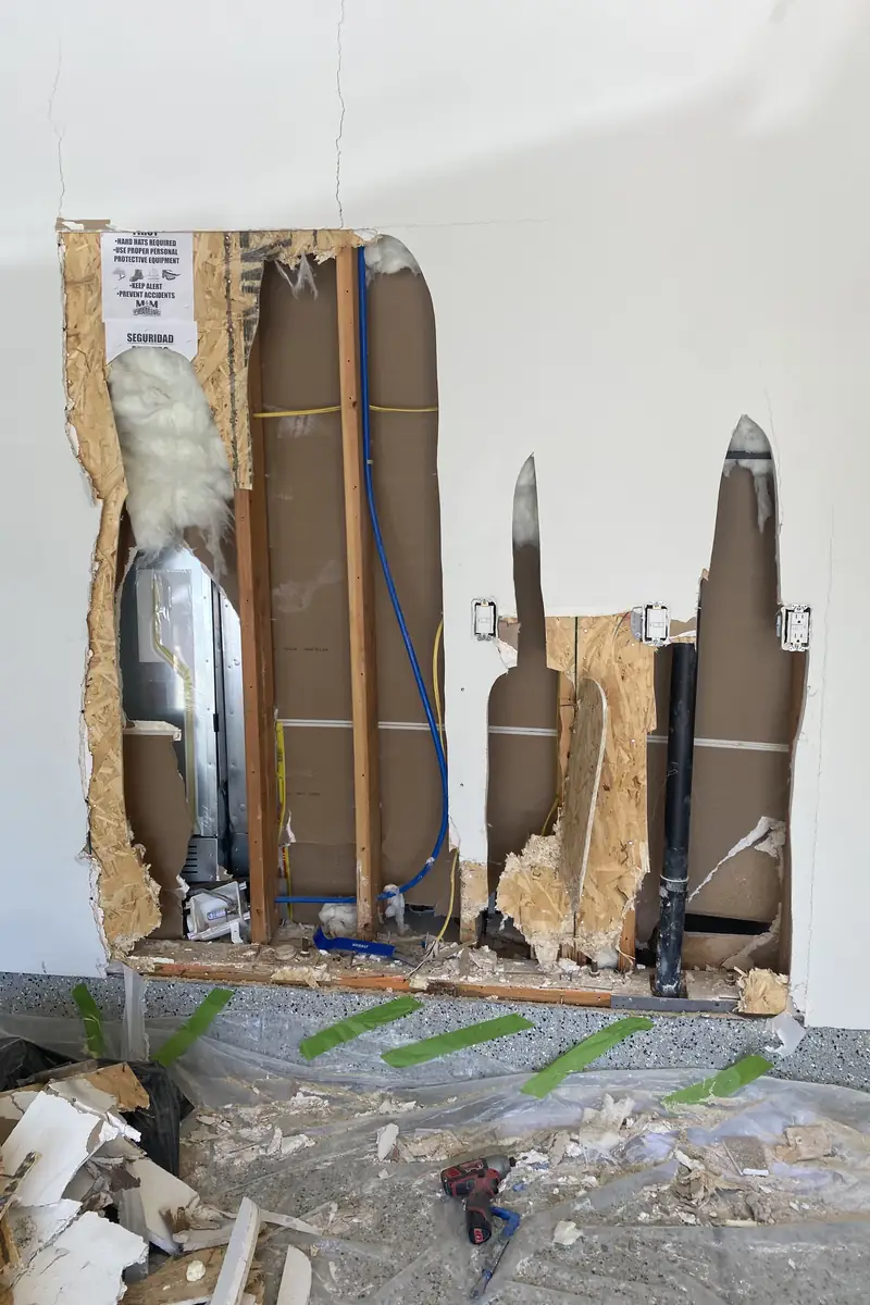 Small, rough openings made to run new plumbing or electrical lines create visible gaps or jagged edges, which rarely align perfectly with existing wall texture and compromise the wall’s integrity.