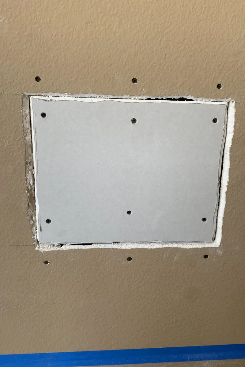 Next, a custom-cut drywall patch is fitted snugly to cover the hole. Skipping exact sizing or using tape alone causes uneven surfaces and visible seams under light reflection.